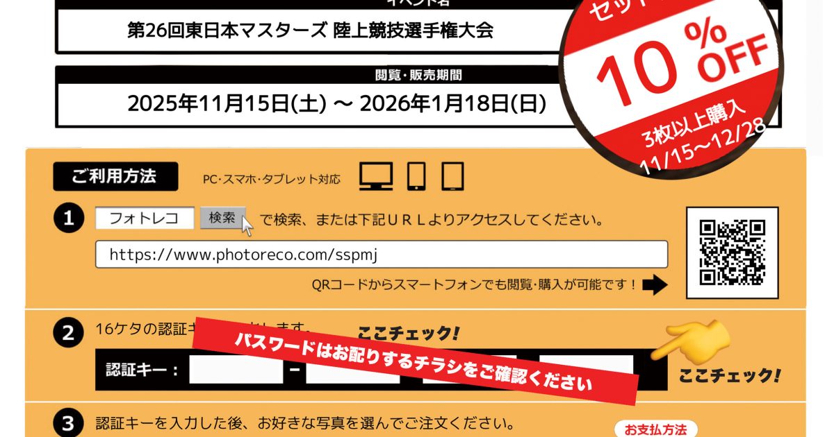 ご好評につき、第26回 東日本マスターズ陸上競技選手権大会でも写真販売することになりました。 【インターネット写真販売の詳細】• 販売サイト: https://www.photoreco.com/sspmj ※閲覧・購 […]